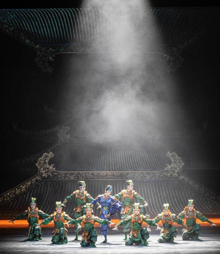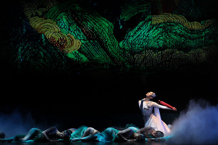 这是舞蹈诗剧《只此青绿》的演出剧照(2024年7月18日摄)。《只此青绿》采用平行空间的叙事方式,从故宫博物院青年研究员的“展卷人”视角出发,讲述北宋著名画家王希孟创作《千里江山图》的故事。该剧连续3年稳居中国舞剧票房榜首,全国巡演超800场,赴多个国家和地区演出50余场,成为传统文化创新表达、中国艺术国际表达的典范之作。