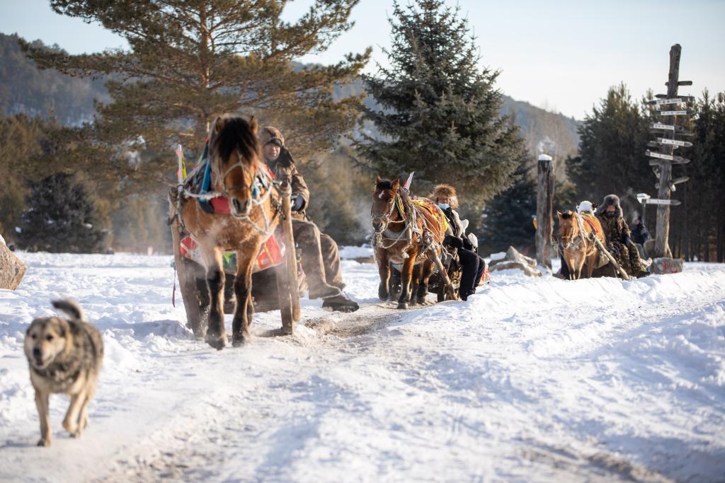 1月10日,在漠河市北极村,游客乘坐马拉爬犁。新华社记者 张涛 摄